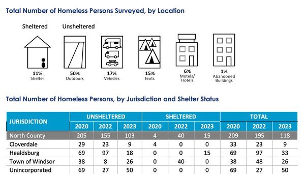 3. There has been a huge drop in the number of "unsheltered" homeless people across Sonoma County since last year, according to the latest "point-in-time census of sheltered and unsheltered homeless families and individuals" released by county officials. These are the lowest numbers we've seen since the county started doing their annual count in 2015. Between January of 2022 and January of 2023, the total number of "persons experiencing homelessness" in the county dropped 22 percent, to 2,266 people — and the portion of them "living in unsheltered" conditions dropped a whopping 72 percent. That decline was even sharper in Northern Sonoma County and Healdsburg in particular, the report shows. There are 33 homeless people in town this year, compared to 97 last year, and only 18 of them are unsheltered, compared to all 97 last year, according to the county stats. (Keep scrolling for a visual!) I'm assuming the other 15 with shelter are being housed at Healdsburg nonprofit Reach for Home's new facility inside the L&M Motel at the south end of town. Reach for Home officials posted on social media yesterday: "We are so excited that as of the end of January 2023, the number of unsheltered individuals in Northern Sonoma County (Windsor, Healdsburg, Geyserville, and Cloverdale) decreased 34%! This follows a 25% decrease from 2020 to 2022. These are huge steps in the right direction as we move towards effectively ending homelessness in Northern Sonoma County." (Sonoma County Government & Reach for Home via Facebook)