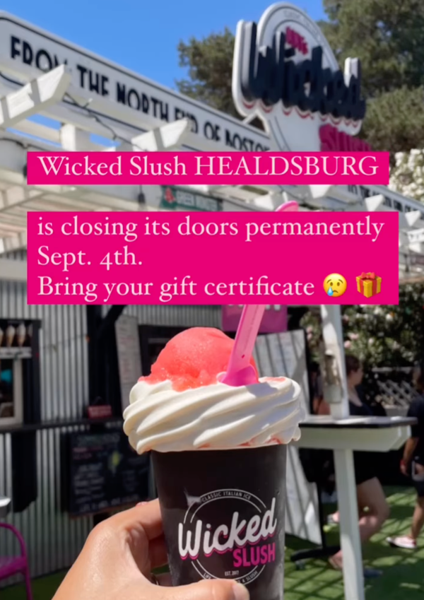 1. It's the end of an era for Amy's Wicked Slush, the dessert stand at the east end of Memorial Bridge near the river. Amy's will shut its doors around two weeks from now, at "close of business" on Monday, Sept. 4, according to its Instagram page. "We have loved serving you these last 7 years," the post says. "Please come see us to say goodbye and let us thank you for your patronage and shared love of SLUSH." In a separate Facebook post, business owners explain that "serious infrastructure issues" have made it "too difficult and too expensive" to keep the Healdsburg location open. Amy Covin, who owns Wicked Slush, put the property up for sale around six months ago, but says she has not yet found a "suitable buyer." More from the Facebook post: "We don't want the legacy of Wicked Slush to be that it was great until Amy sold it, and then it all changed and wasn't even close to what it was. We are still talking with some people, and if we all cross our fingers at the same time, maybe one will prove to be 'the one'!" Amy has another location in Novato that will stay open for now, and her special brand of slush will also continue to be served at the Sonoma Fun Center. Here's some more backstory from the Press Democrat: "The Healdsburg favorite launched in May 2017 after Covin left a 25-year accounting career. Covin, who is from Boston, grew up with slush and felt the need to bring it to Sonoma County. The business was a quick success and served up to 1,500 customers daily on a summer weekend. ... The 1,242-square-foot property is currently listed on LoopNet at $700,000. Previous Press Democrat reporting showed the listing was for both the land and business for $2.4 million. [The realtor] said although there have been many potential buyers, they have been more interested in functioning as landlords and have not expressed interest in purchasing or running the business. She added that should a buyer purchase both the business and the land, Covin is happy to train the new owners." (Shop Local Healdsburg via Instagram & Amy's Wicked Slush via Instagram & Amy's Wicked Slush via Facebook & LoopNet & Press Democrat; paywall)