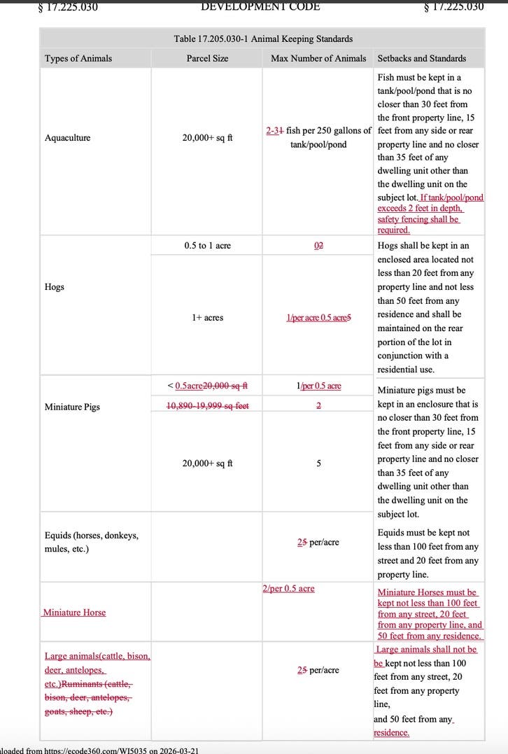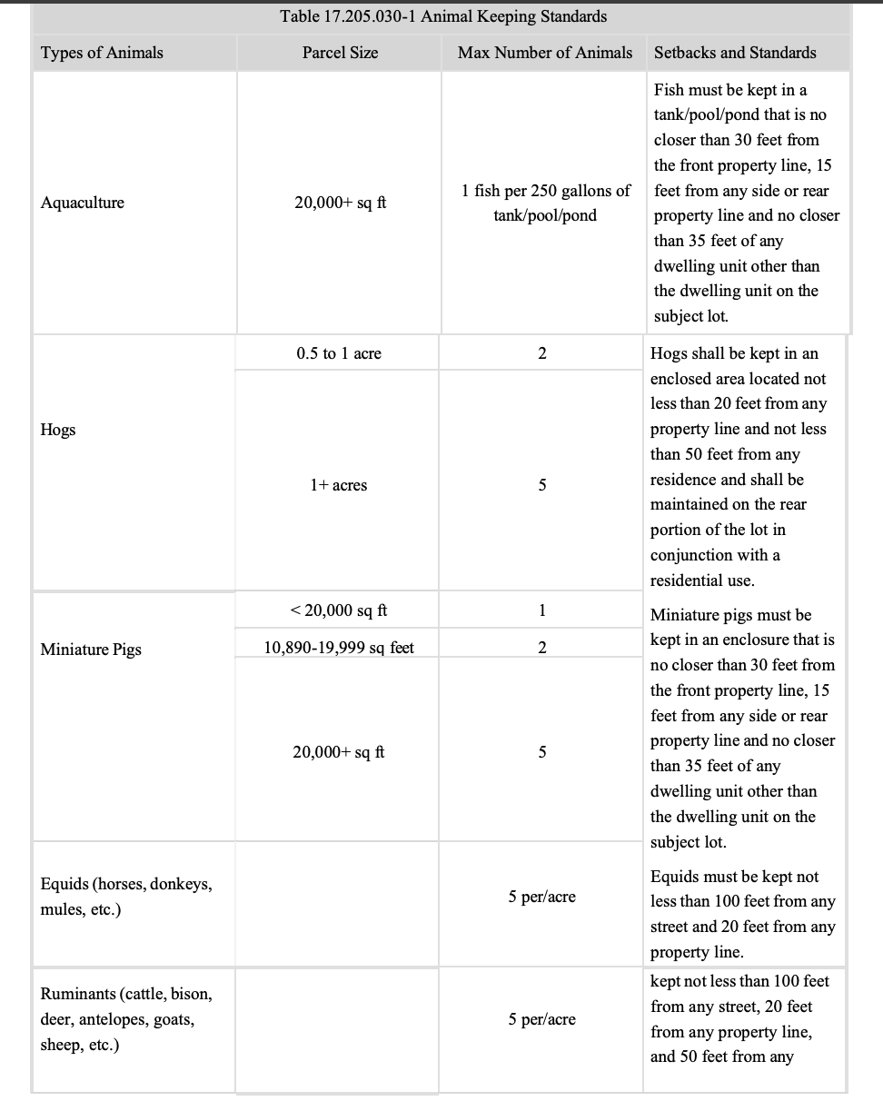 The initial discussion on livestock reduction also applied to hogs, mini pigs, and miniature horses. Those proposed changes did not make it into the final draft of the document.