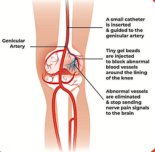 GAE targets the underlying source of arthritis-related pain by reducing abnormal blood flow and inflammation. The procedure is performed through a tiny catheter and does not involve incisions, general anesthesia, or joint replacement.