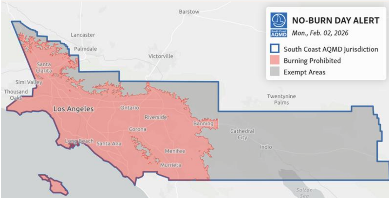 TEMECULA VALLEY, CA — The South Coast Air Quality Management District issued a No-Burn Alert for Monday, prohibiting wood burning in fireplaces and in all indoor or outdoor devices across Riverside County and three other counties.