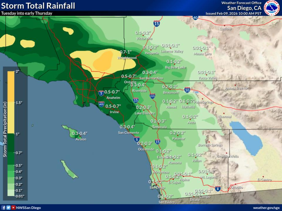 The Riverside metropolitan area is predicted to receive about a quarter inch of precipitation as the trough of low pressure lurches eastward. Lingering scattered showers are also expected Thursday, followed by clearing on Friday and most of Saturday, the weather service said.