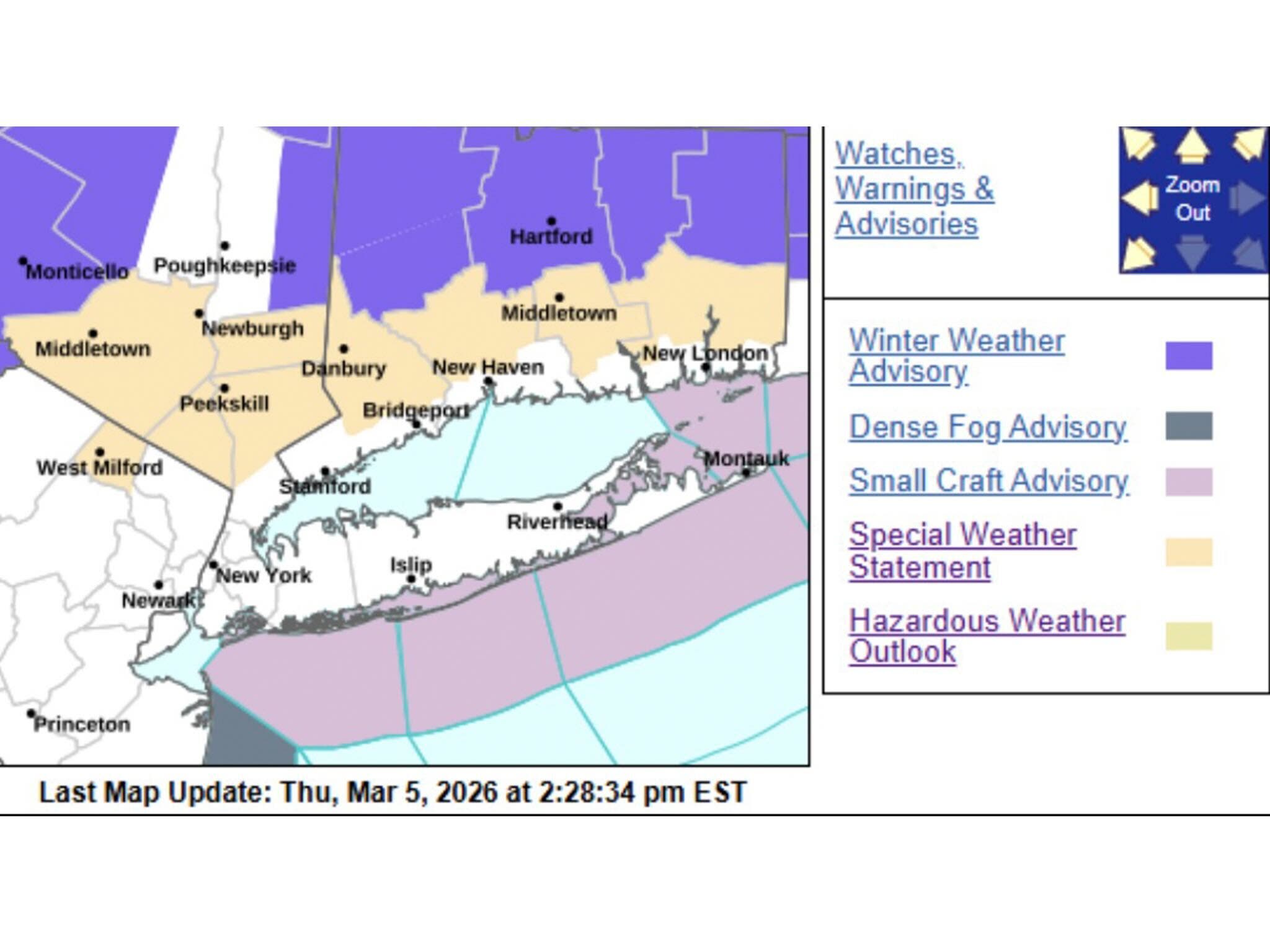 Winter weather advisories are in effect from 5 p.m. Thursday to noon on Friday for the Connecticut River Valley, and Hartford, Litchfield, Tolland and Windham counties, according to the National Weather Service.