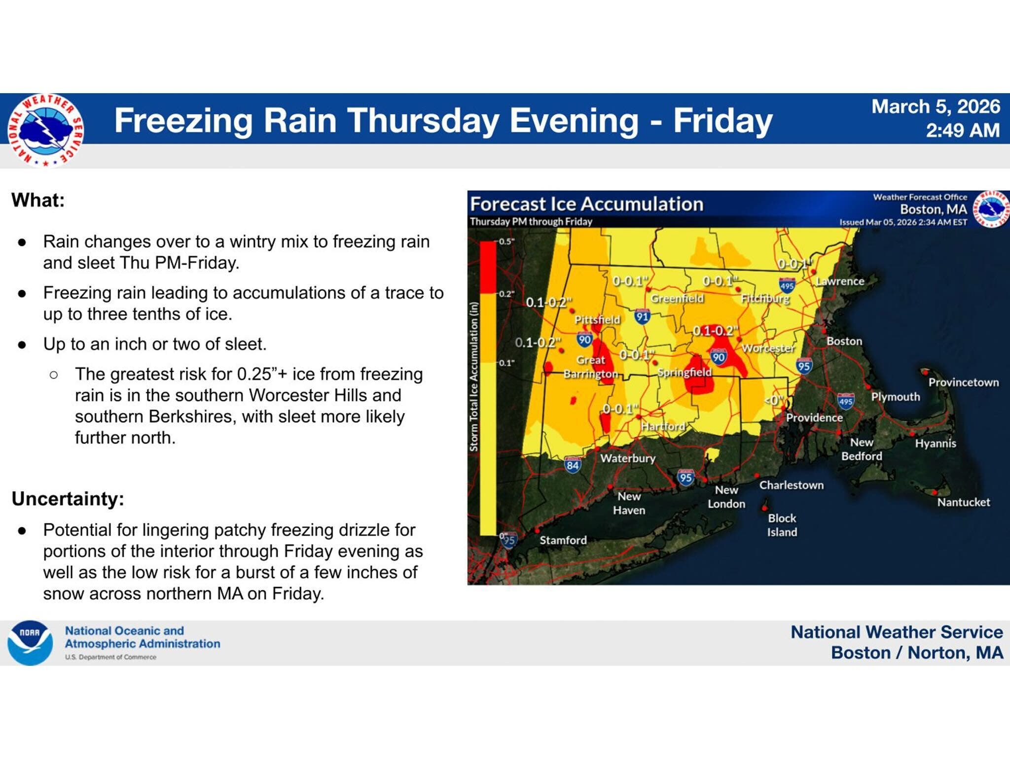 Freezing rain could lead to an accumulation of ice, ranging between a trace and three-tenths of an inch in northern Connecticut, according to the National Weather Service’s Boston office.