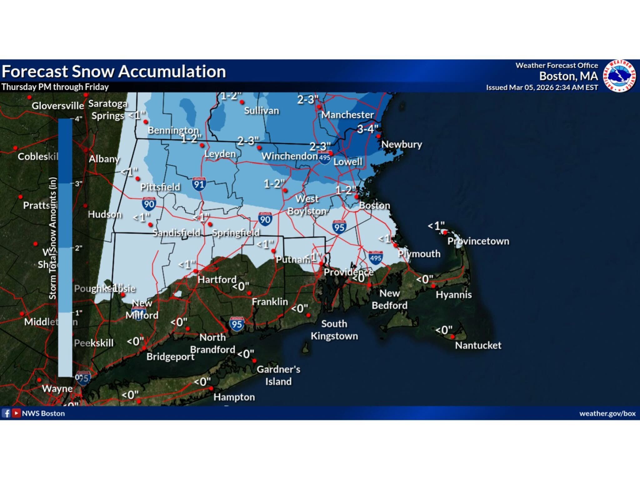 Snow accumulation will be less than an inch in northern Connecticut, it reported Thursday morning.