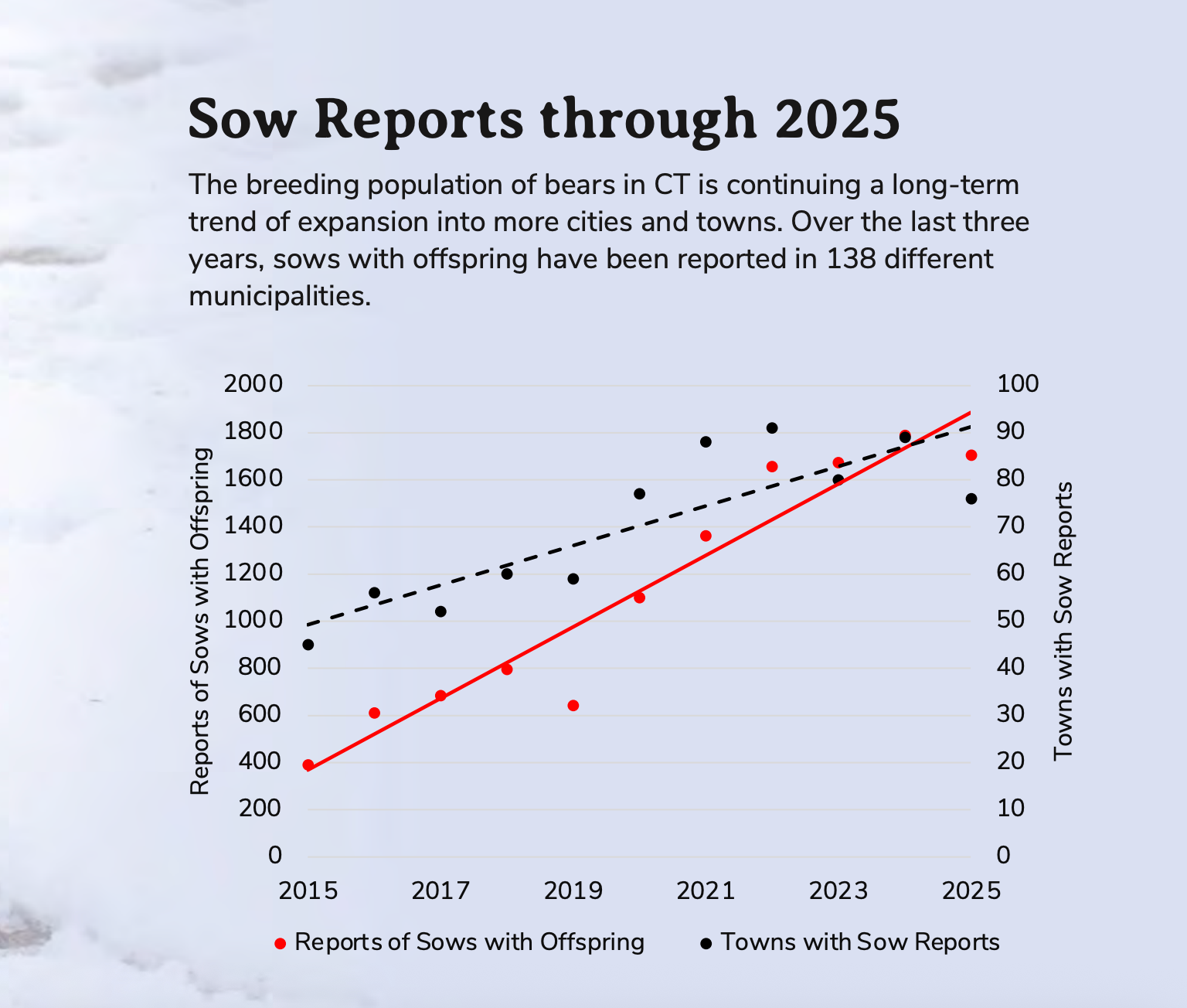 "These numbers are a sharp contrast to a decade ago, when bears entered homes fewer than 10 times annually," DEEP officials said. "No matter where you live in Connecticut, you could encounter a bear, as sightings have been recorded in all 169 towns and cities."
