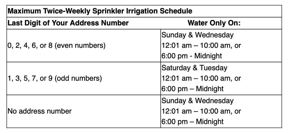 The twice-weekly irrigation schedule is now in effect and remains in place until Oct. 31. Aquarion said drip irrigation, soaker hoses and hand-held watering are allowed at any time.