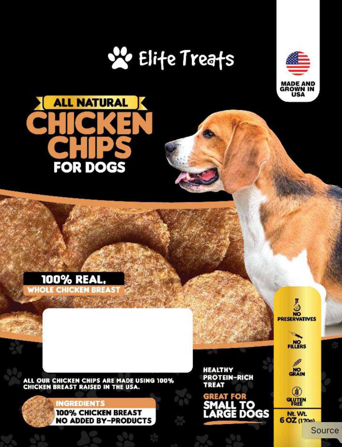 Elite Treats LLC of Boca Raton is recalling a single lot of its "Elite Treats Chicken Chips for Dogsβ in 6-ounce bags. The product is marked with lot No. 24045 and an expiration date of April 2027.
