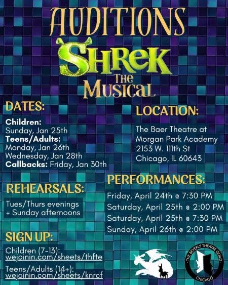 CHICAGO – The Beverly Theatre Guild will host open auditions for its 63rd season closer, “Shrek: The Musical.” Roles are open for children, teens and adults.