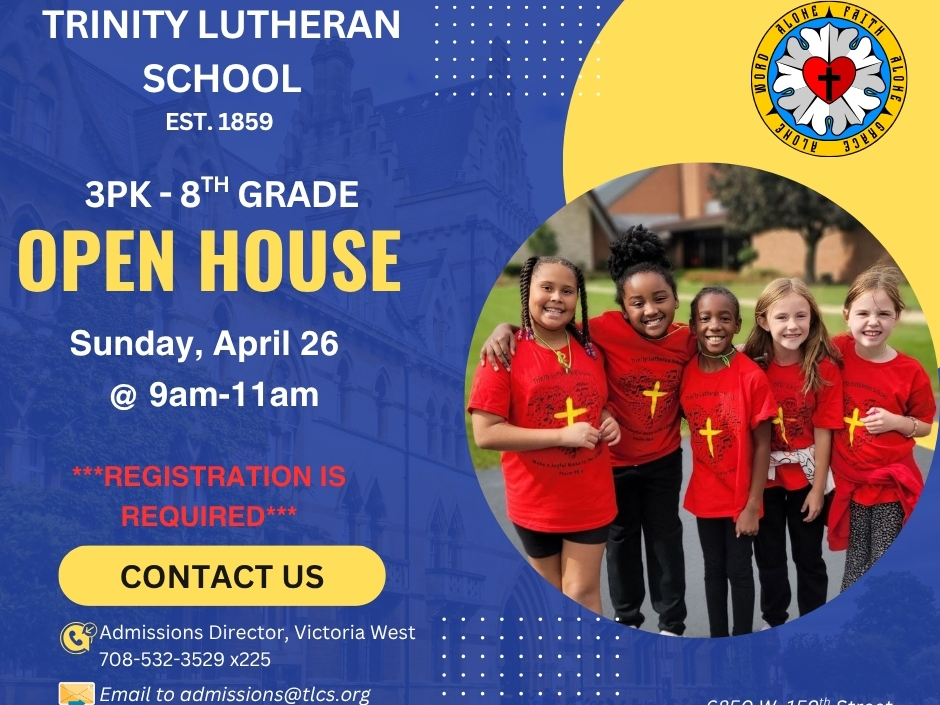 Trinity Lutheran School will be hosting an Open House on Sunday, April 26. Trinity educates grades 3 year old PreK through 8th grade.
