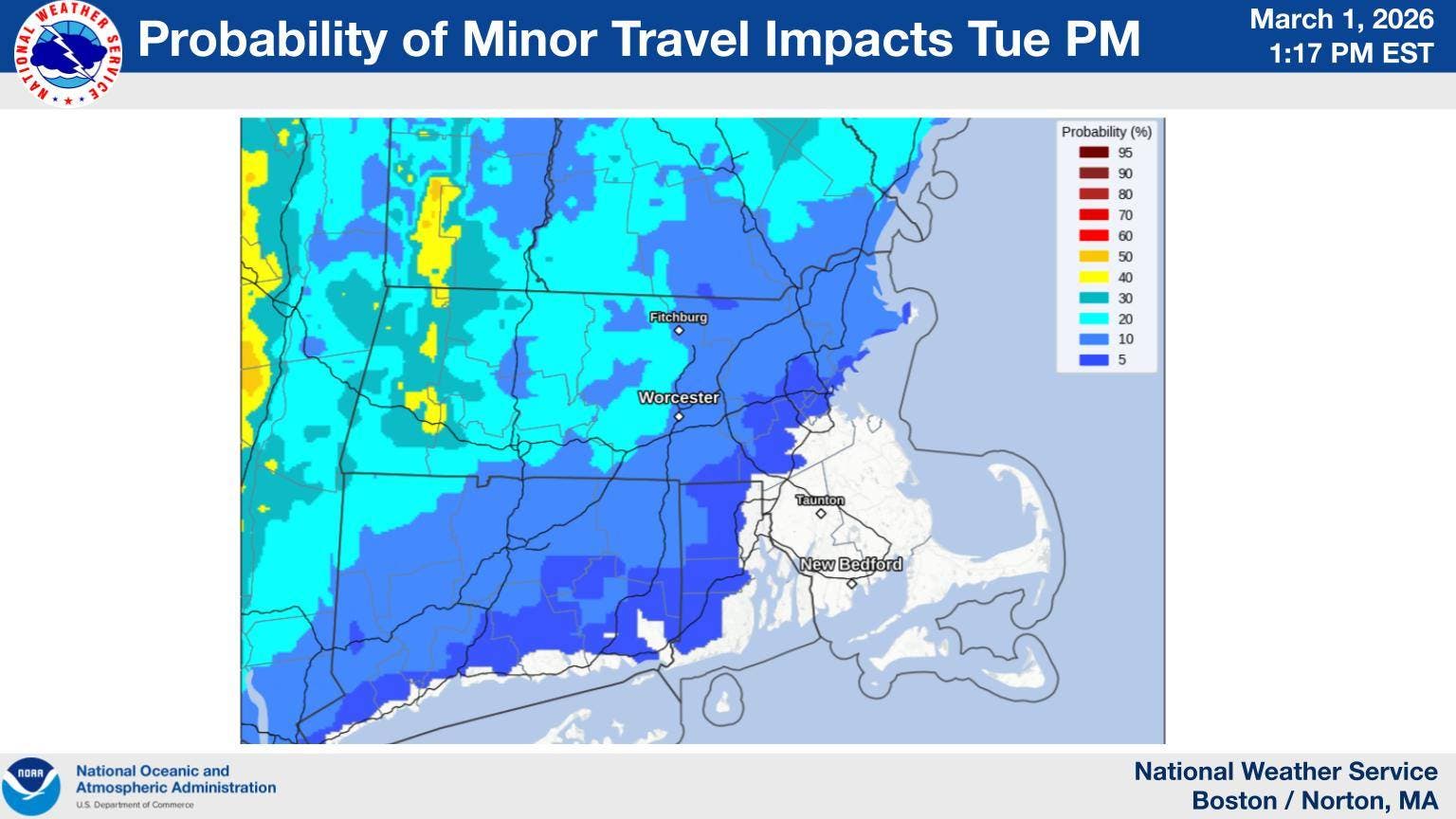 Some areas of Massachusetts will see slippery travel and more accumulating snow on Tuesday.