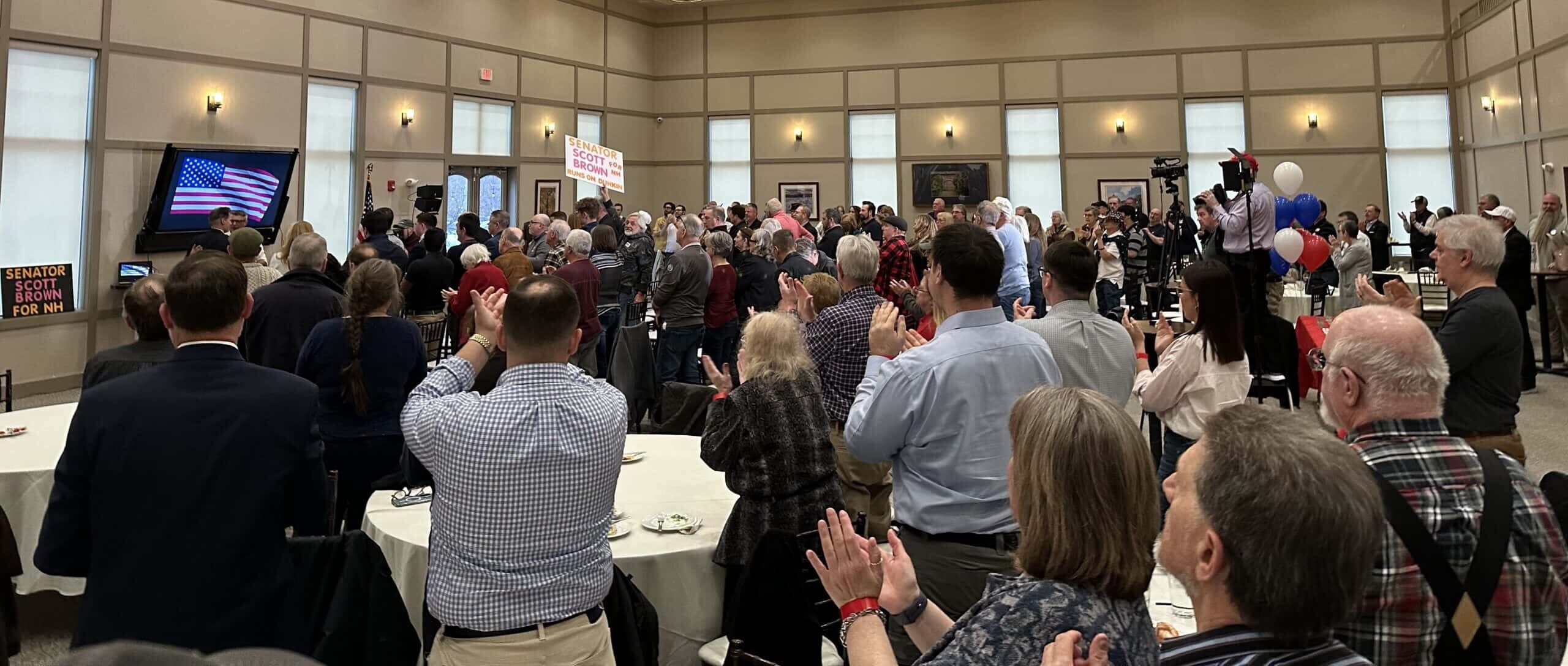 A crowd of supporters greets Scott Brown at a campaign rally in Bedford, N.H.