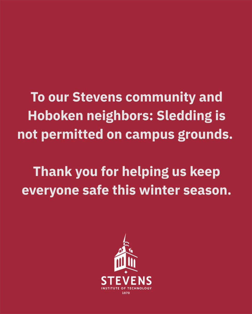 They posted on Instagram on Monday: "To our Stevens Community and Hoboken neighbors: sledding is not permitted on campus grounds. Thank you for helping us keep everyone safe this winter season."