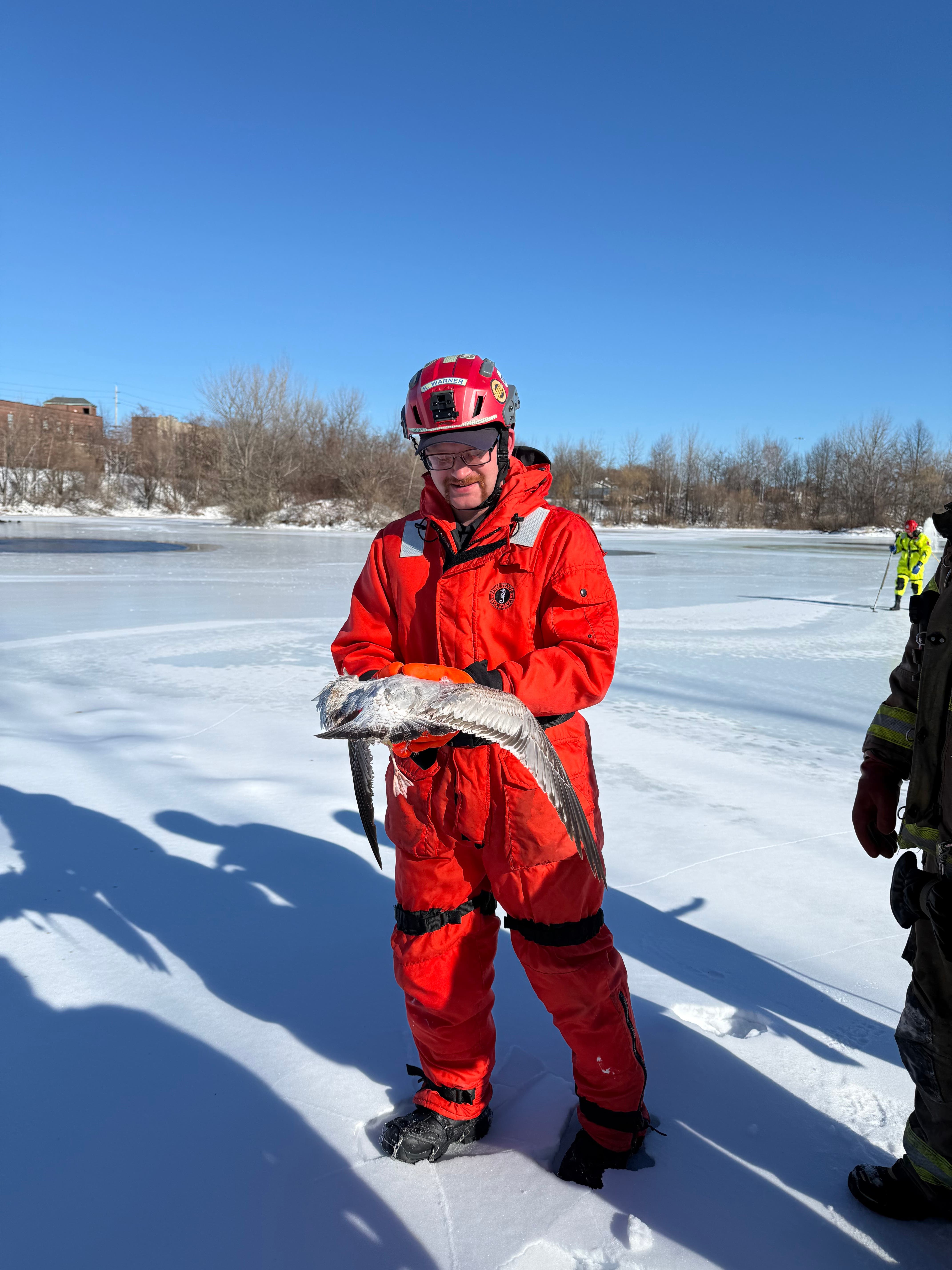 "When the JCFD unit began their ice rescue training, most birds in the area had typical reactions and flew off," she said. "However, the one bird did not leave. That's what caught the firefighters' attention. They thought it was odd the seagull wasn't flying away.