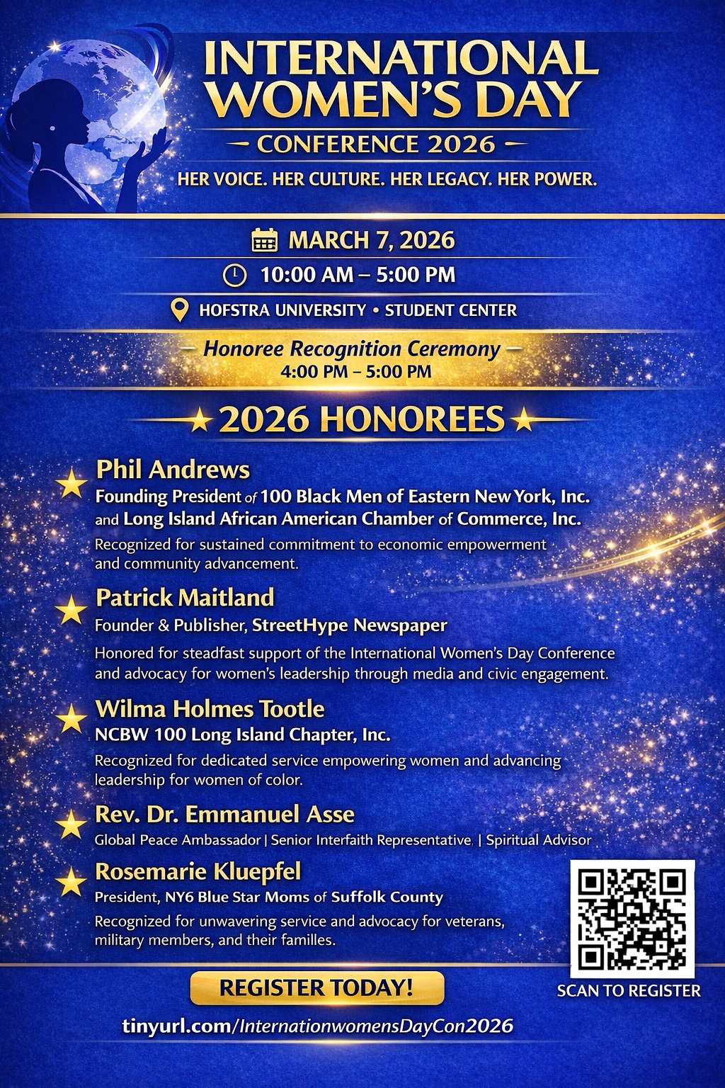 The International Women’s Day Conference 2026, one of the region’s most anticipated annual gatherings celebrating women’s leadership, equity, and impact, will honor five distinguished leaders during a special Award Recognition Ceremony from 4:00 p.m. to 5:00 p.m. on Saturday, March 7, 2026, at the Student Center at Hofstra University.