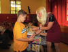 1: Board of Education President Janet Goller presents an award to a student from Charles A. Reinhard Early Childhood Center for his participation in the Student Advisory Council.