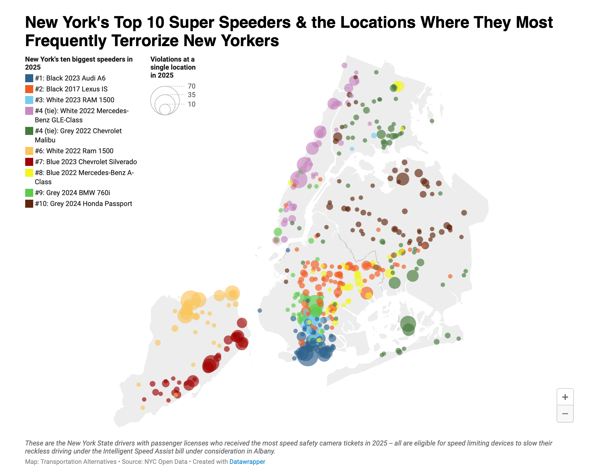 “These Super Speeders blast their cars and trucks through New York City’s neighborhood streets at deadly speeds every day, getting caught hundreds of times a year, undeterred. Together, their reign of terror touches almost every corner of the city," Ben Furnas, Executive Director of Transportation Alternatives, said in a statement.