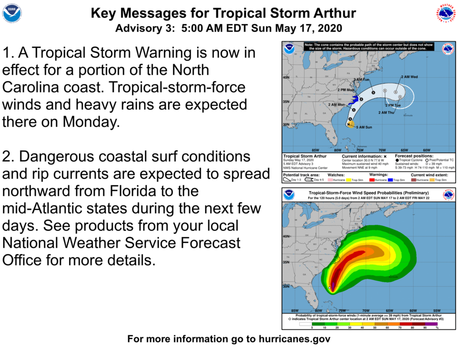 NORTH CAROLINA — As Tropical Storm Arthur became the first named storm of the 2020 Atlantic hurricane season Saturday, a tropical storm warning was issued for the coast of North Carolina.