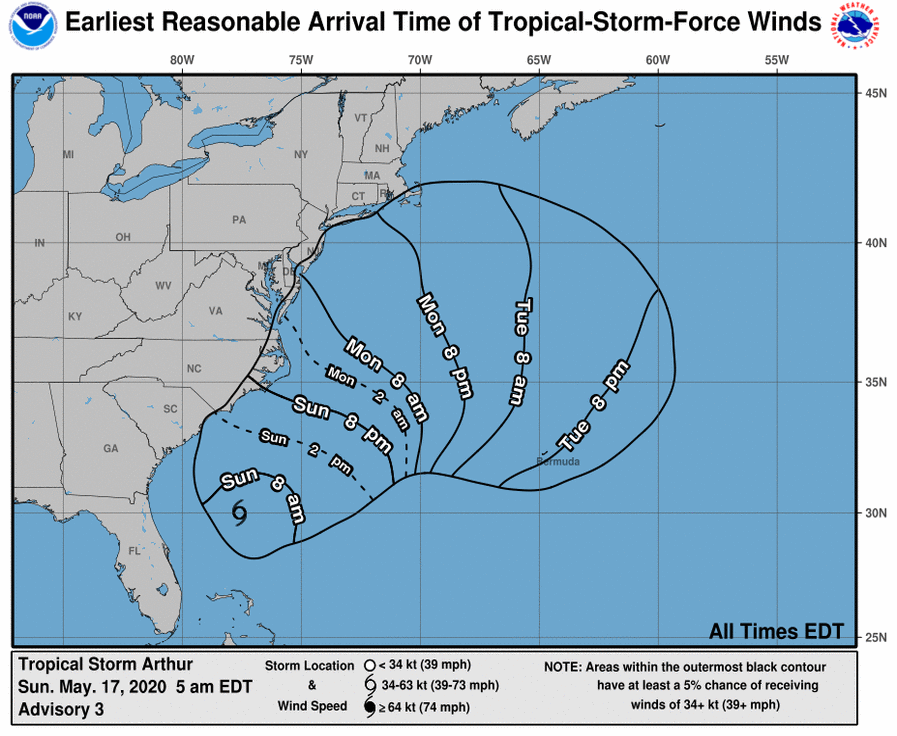Arthur was packing sustained winds near 40 mph early Sunday morning, just over the 39 mph threshold to be considered a tropical storm. Peak wind forecast is set for 15-25 mph with gusts to 40 mph, but potential for wind 39 to 57 mph.