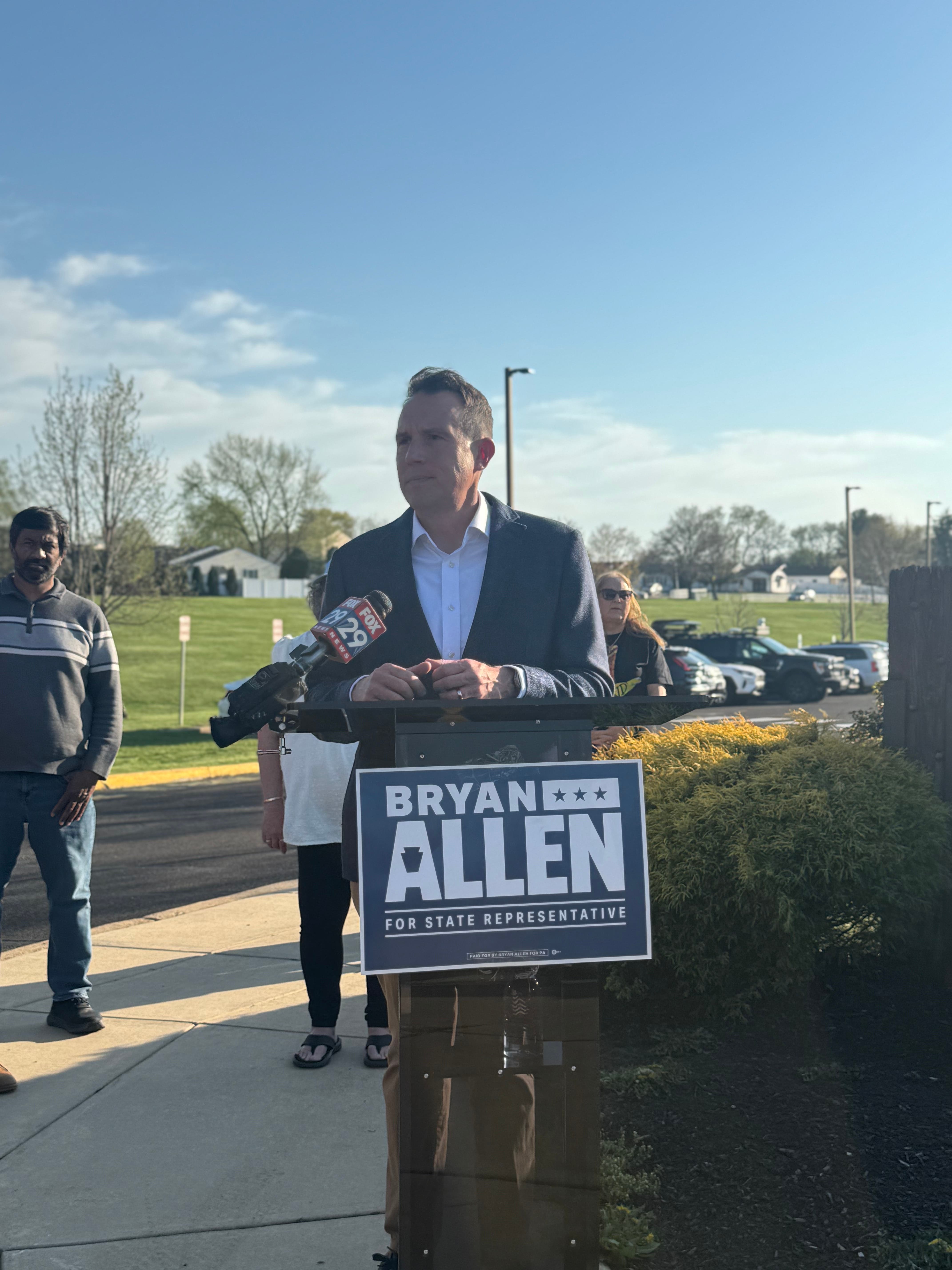 Democratic challenger Bryan Allen held a press conference this week at the Bensalem Township School District administration building to discuss the "growing multi-million dollar budget deficit and the mounting pressure that the state’s outdated special education and charter reimbursement formulas have placed on local taxpayers and public schools."