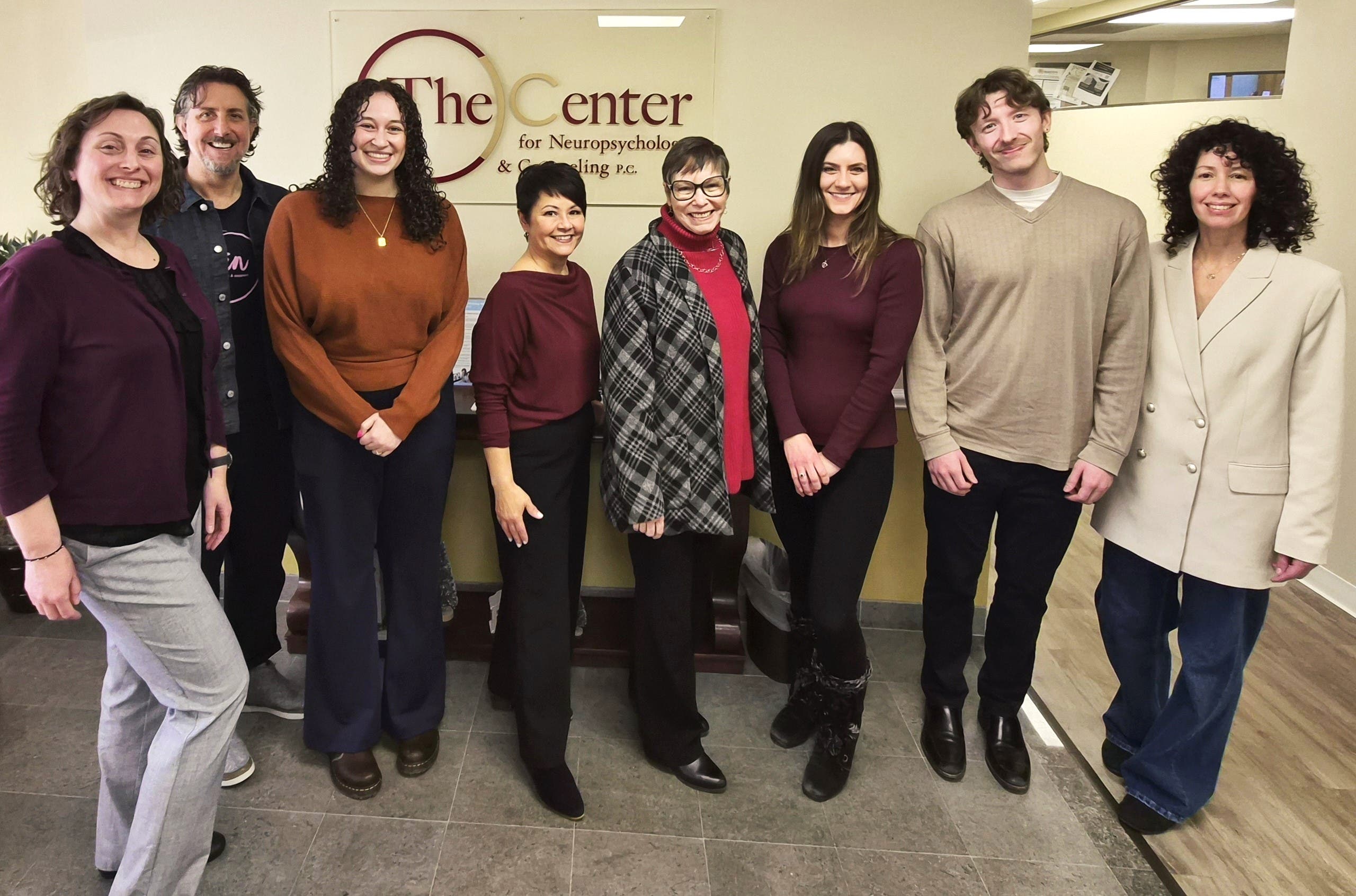 From left are Valerie Walter, Keith Fenimore of Kin, Hannah Corrado, MS; Christina Carson-Sacco, PsyD; Dr. Mary G. Brownsberger, PsyD, ABPP of Kin; Lorna Jansen, PsyD; Connor Pailas, BA, and Kristina of Kin.