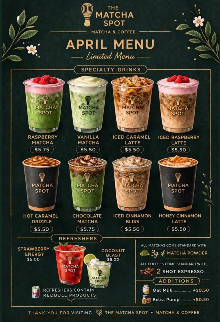The Matcha Spot — located at 18 Horsham Road — offers handcrafted matchas, iced and hot lattes, and signature refreshers.