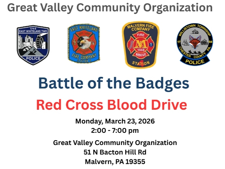 On Monday, March 23, from 2:00–7:00 PM, community members are invited to donate blood at GVCO, located at 51 N. Bacton Hill Road in Malvern, and take part in the “Battle of the Badges.” Donors will have the opportunity to cast a vote for their favorite local police or fire department. The department with the most votes will earn bragging rights and a trophy.