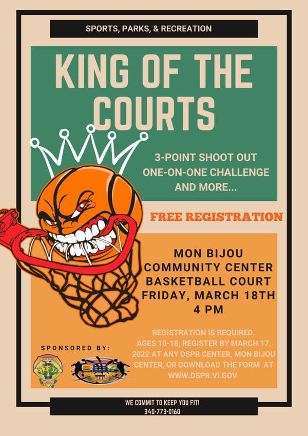 - King of the Courts on St. Croix is back: For ages 10-18 on March 18th! Registration is required. Download the registration form at www.dspr.vi.gov or register at any DSPR center or Monbjou center! (Department of Sports, Parks and Recreation)