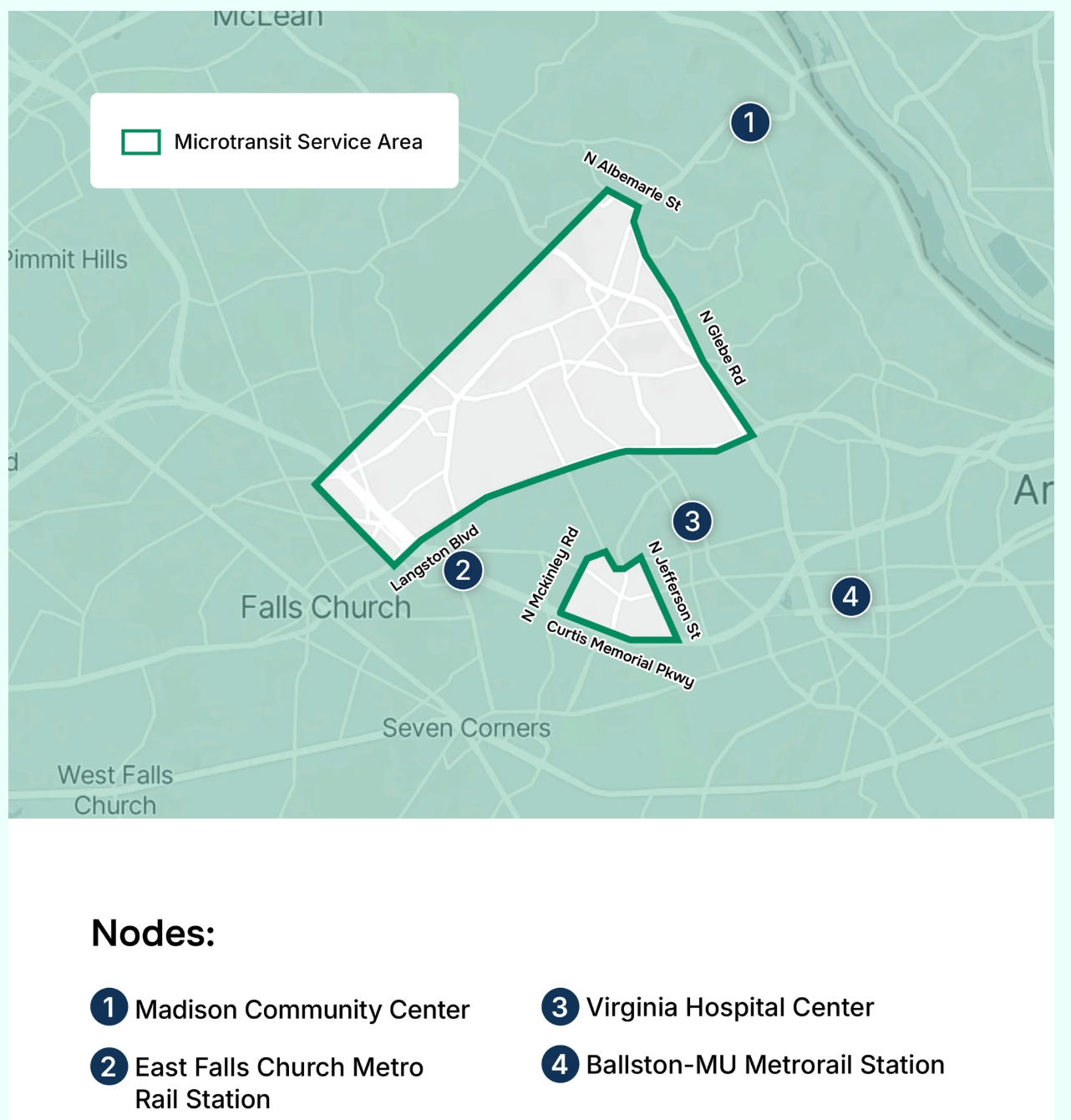 During the initial period, MICRO will operate in a defined zone in northwest Arlington, generally bounded by North Glebe Road, Langston Boulevard and the county line. The service will connect riders to Ballston-MU and East Falls Church Metrorail stations, Virginia Hospital Center, Madison Community Center, local schools and the Westover neighborhood.