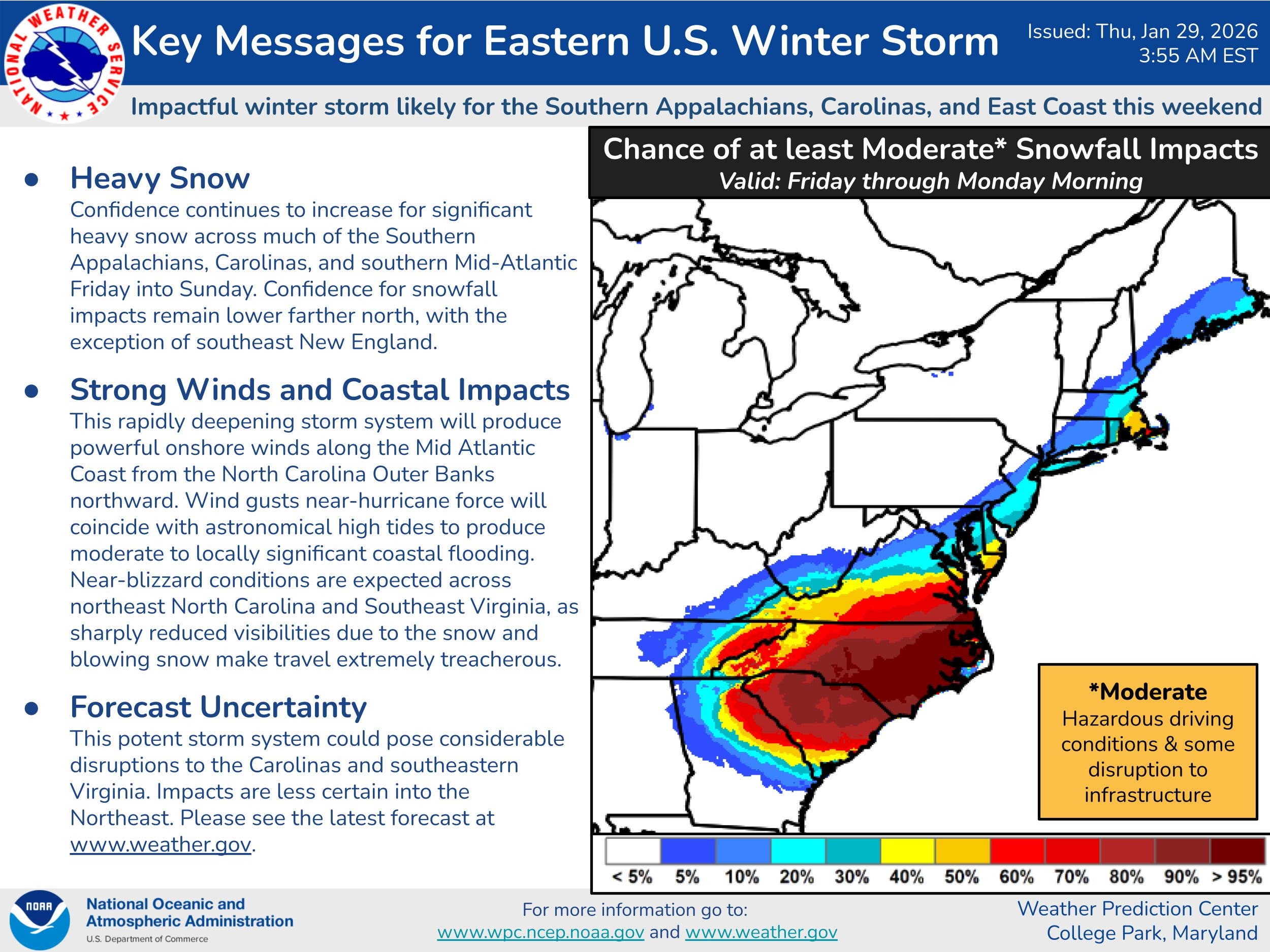 For Northern Virginia, chances for significant snowfall are less. AccuWeather predicts the area could receive 1-3 inches of snow from Friday to Sunday, as well as 30 to 50 mph wind gusts. The National Weather Service's Weather Prediction Center said the region has a 10 to 20 percent chance of seeing moderate snowfall.